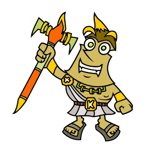 This features a cartoon character, possibly a Roman wizard or a similar mythical figure, holding a flaming red staff in one hand and a green sword in the other. This unique combination of weapons suggests that this character might be a powerful sorcerer with a strong presence on the battlefield. The character is dressed in a white robe and sandals, which adds to its regal appearance. Overall, the image portrays an intriguing and imaginative figure that could be part of a fantasy world or a comic book storyline.