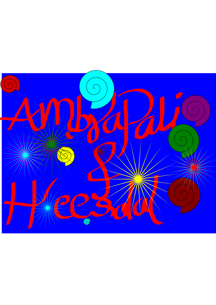 This is a colorful and creative artwork featuring the words "Ambapalli & Heesanand" written in red on a blue background. The text is surrounded by various shapes, including stars and circles of different sizes, which add to the visual appeal of the piece. These shapes are scattered throughout the image, with some located near the top left corner, others in the middle section, and a few towards the bottom right side. Overall, this artwork showcases an interesting combination of text and colorful elements that make it stand out as a unique and eye-catching piece.