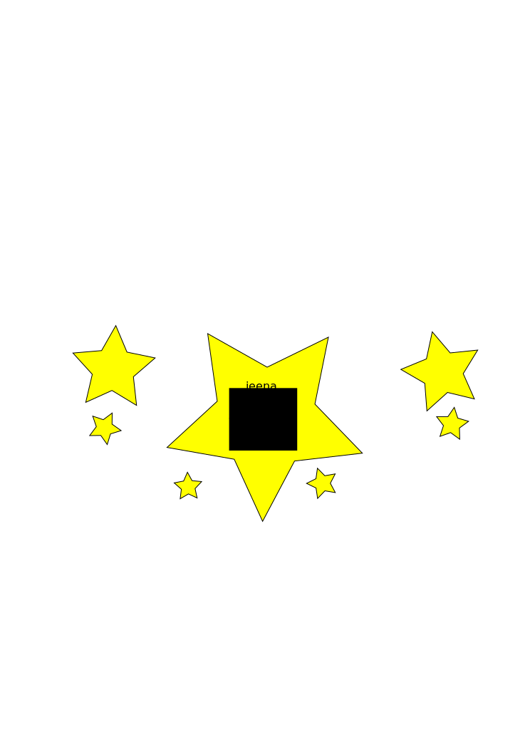 This features a yellow star with a black center, surrounded by several white stars. The yellow star is positioned in the middle of the scene and appears to be the main focus of the image. The surrounding white stars are scattered throughout the background, creating a sense of depth and dimension to the overall composition. This artistic arrangement of stars gives off an impression of a celestial theme or a decorative design element.