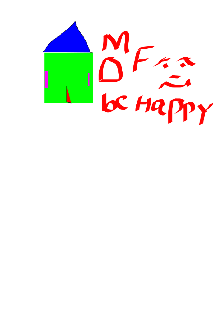 This features a house with the words "MF be happy" written on it. The house is colored in green and blue, giving it a unique appearance. The message displayed on the house seems to convey positivity and happiness, as the letters are arranged in such a way that they form a smiley face. This creative display of text adds an interesting visual element to the scene.