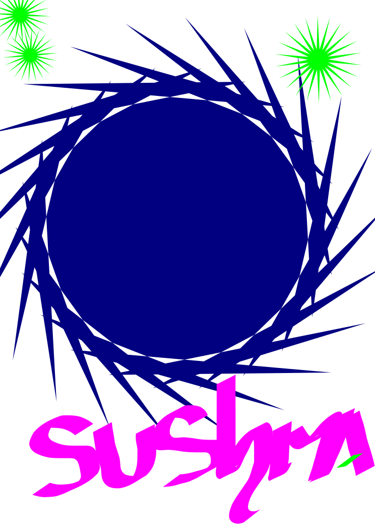 This features a blue circle with a black center, which is surrounded by green stars. The circle appears to be the focal point of the image and has the word "Sushi" written in pink letters around it. The combination of colors and text creates an interesting visual effect that draws attention to the central subject.
