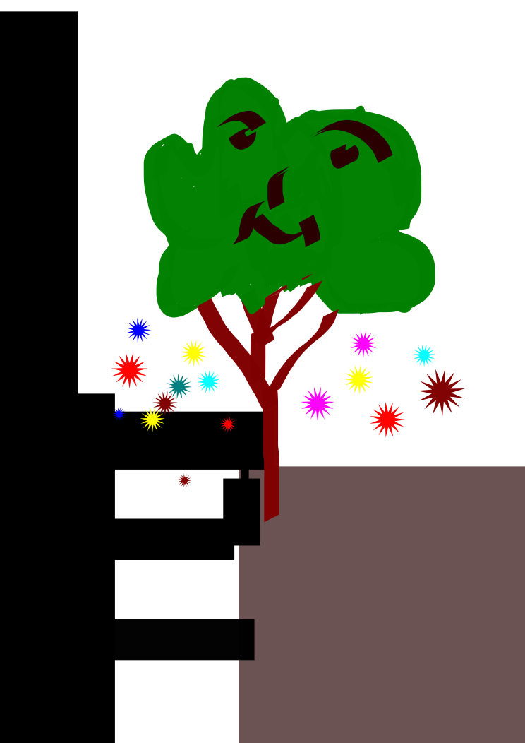 This features a tree with a face drawn on it, giving the impression of a smiling tree. The tree is surrounded by various colorful stars scattered around its branches and trunk. There are at least 13 stars in total, varying in size and positioning. The combination of the tree's face and the stars creates an interesting and playful scene that captures attention.