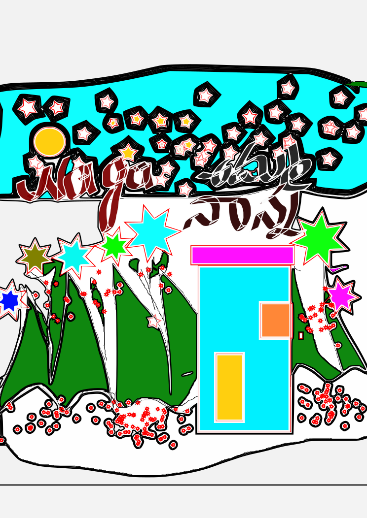 This is a colorful and creative drawing of a house with Christmas trees in front of it. The house has a blue door, and the trees are adorned with stars. There are several other stars scattered throughout the scene, adding to its festive atmosphere. The overall design gives off a whimsical vibe, making it an interesting piece of artwork.