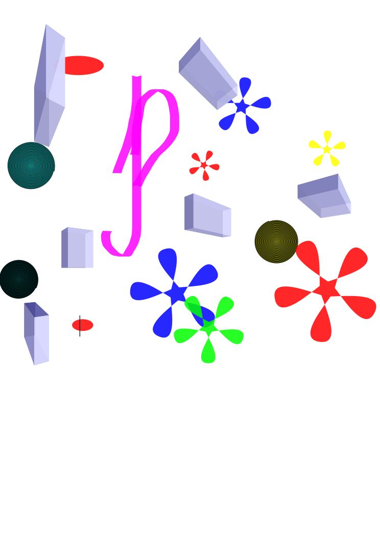 This features a collection of colorful geometric shapes, including stars and flowers. These shapes are scattered across the scene in various sizes and colors, creating an eye-catching display. Some of the shapes have letters on them, adding to the visual interest of the composition. Overall, the image presents a vibrant and lively atmosphere with its diverse array of geometric forms.