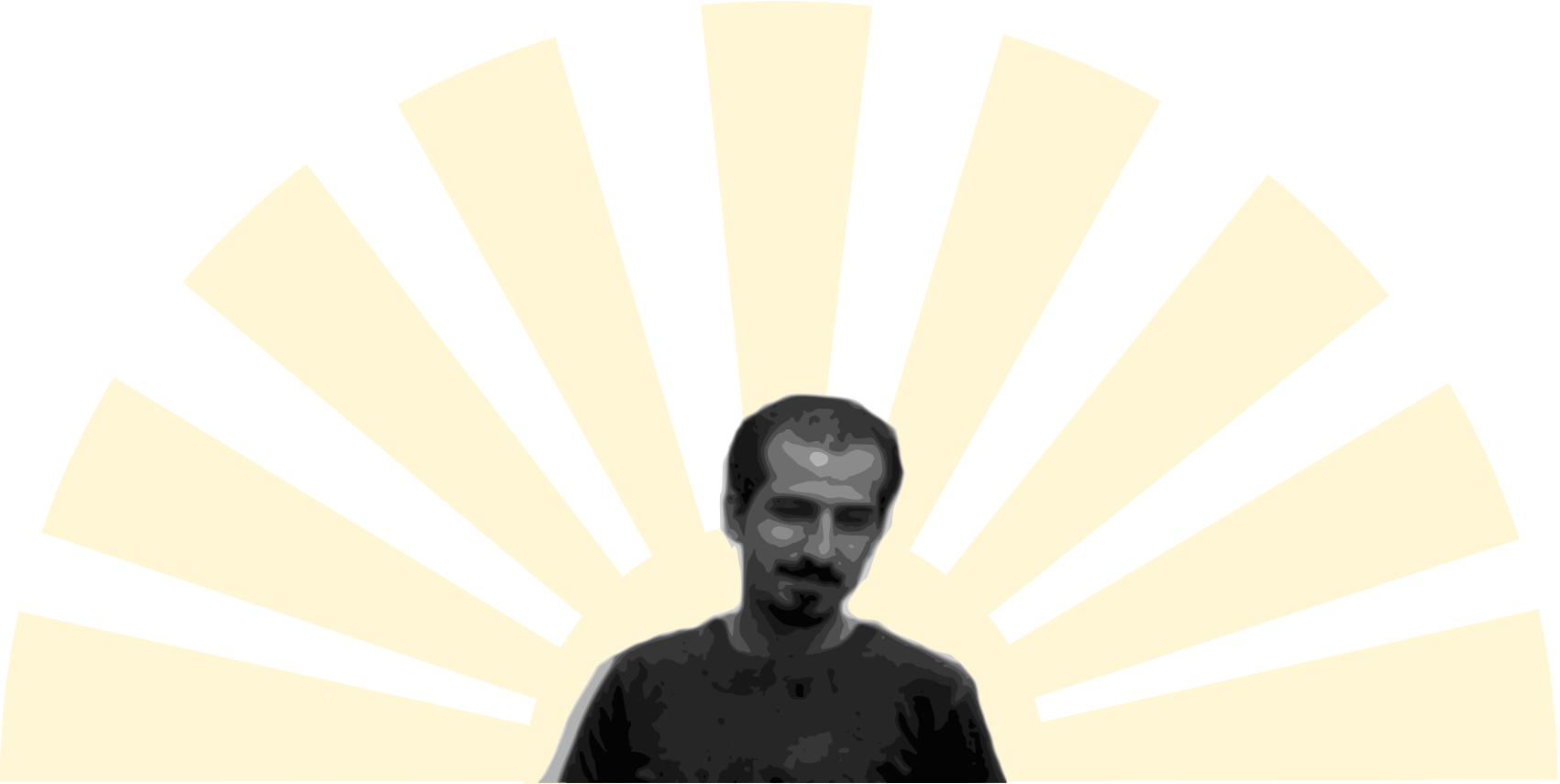This features a man with a beard and mustache, wearing a black shirt. He is the main subject of the picture, taking up most of the frame. Behind him, there is a yellow sun rising in the background, creating an interesting contrast between the man's dark clothing and the brightness of the sun. The overall composition of the image gives off a sense of warmth and positivity, with the sun shining behind the subject, illuminating his face and casting a soft glow on his surroundings.