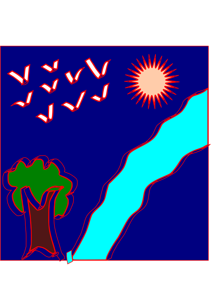 This features a beautiful painting of a tree with birds flying around it. There are several birds in the scene, some closer to the tree and others further away. Above the tree, there is a sun shining brightly, creating a warm atmosphere. In addition to the tree and birds, there is also a river visible in the background, adding depth and dimension to the painting. The combination of the tree, birds, and sun creates an idyllic and serene scene that captures the viewer's attention.