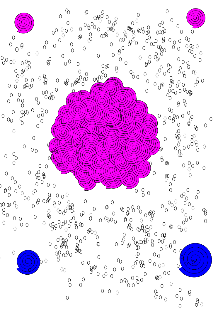 This features a pink and blue circle with a dot in the center. This circle is surrounded by several other dots, creating an interesting pattern. The dots are scattered throughout the scene, some closer to the edges of the image while others are more centrally located. Overall, it's a visually engaging composition that combines different colors and shapes.
