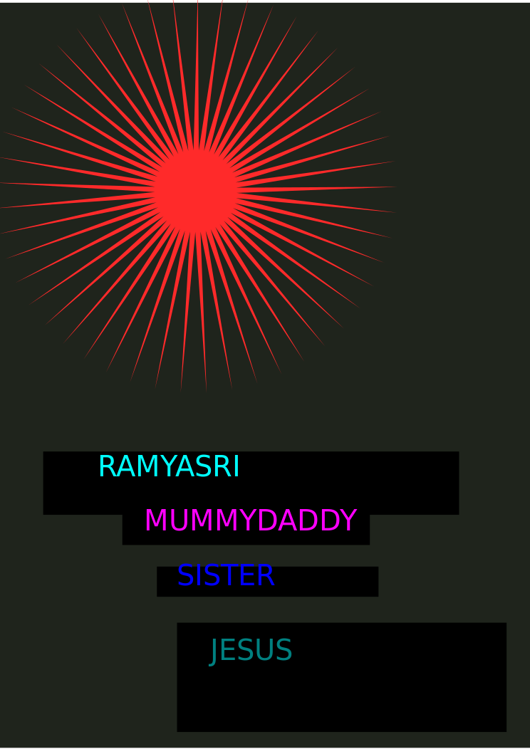 This is a black and white picture of an orange sun with red rays. In the middle of the sun, there are words written in blue that say "Ramya". Surrounding this central point, there are more words written in different colors such as purple, pink, green, yellow, and orange. These words appear to be part of a larger message or artistic expression. The combination of the sun's rays and the colorful writing creates an interesting visual effect that draws attention to the central point.