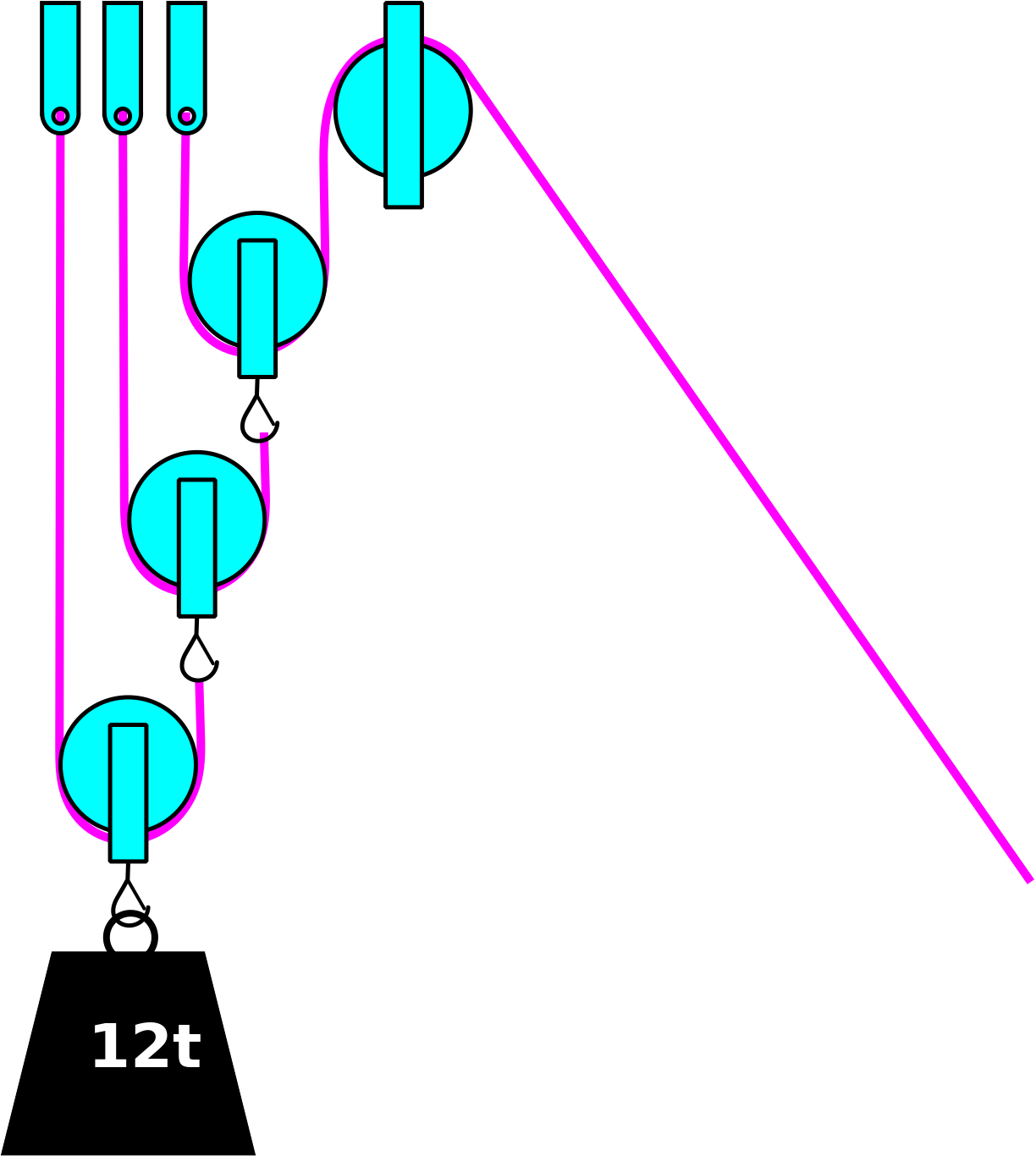 This features a pulley system with a black block at the bottom. The block has "12t" written on it in white, indicating that this is a 12-ton weight. The pulleys are all light blue and attached via pink wires, creating an interesting visual contrast between the colors of the pulleys and the wires. This unique design adds a touch of creativity to the overall appearance of the system.