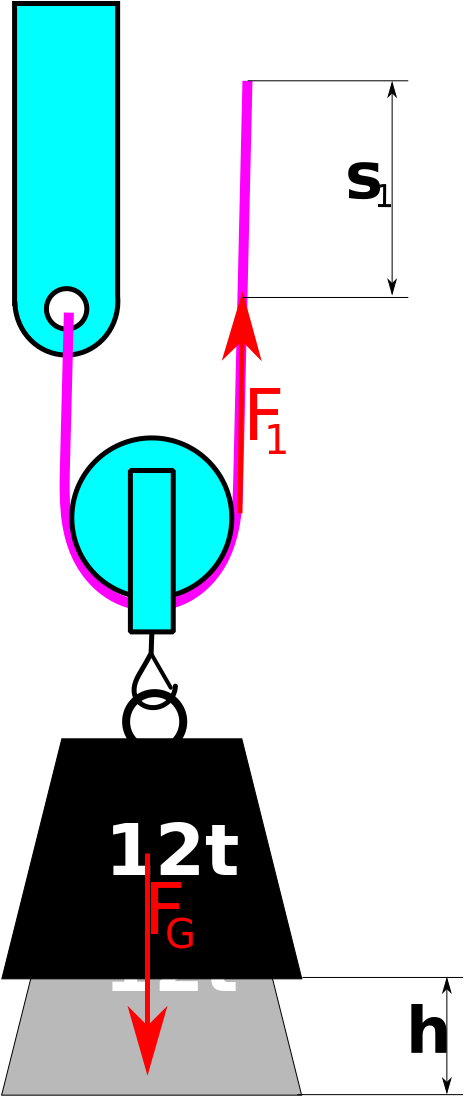 This features a mechanical device with a red arrow pointing upwards, indicating the force applied to it. A number 12 is also visible on the device, possibly representing its weight or measurement. This machine appears to be used for measuring or testing purposes, as it has been described as a "moving pulley" and a "way." The image may depict an industrial setting where such devices are utilized for various tasks.