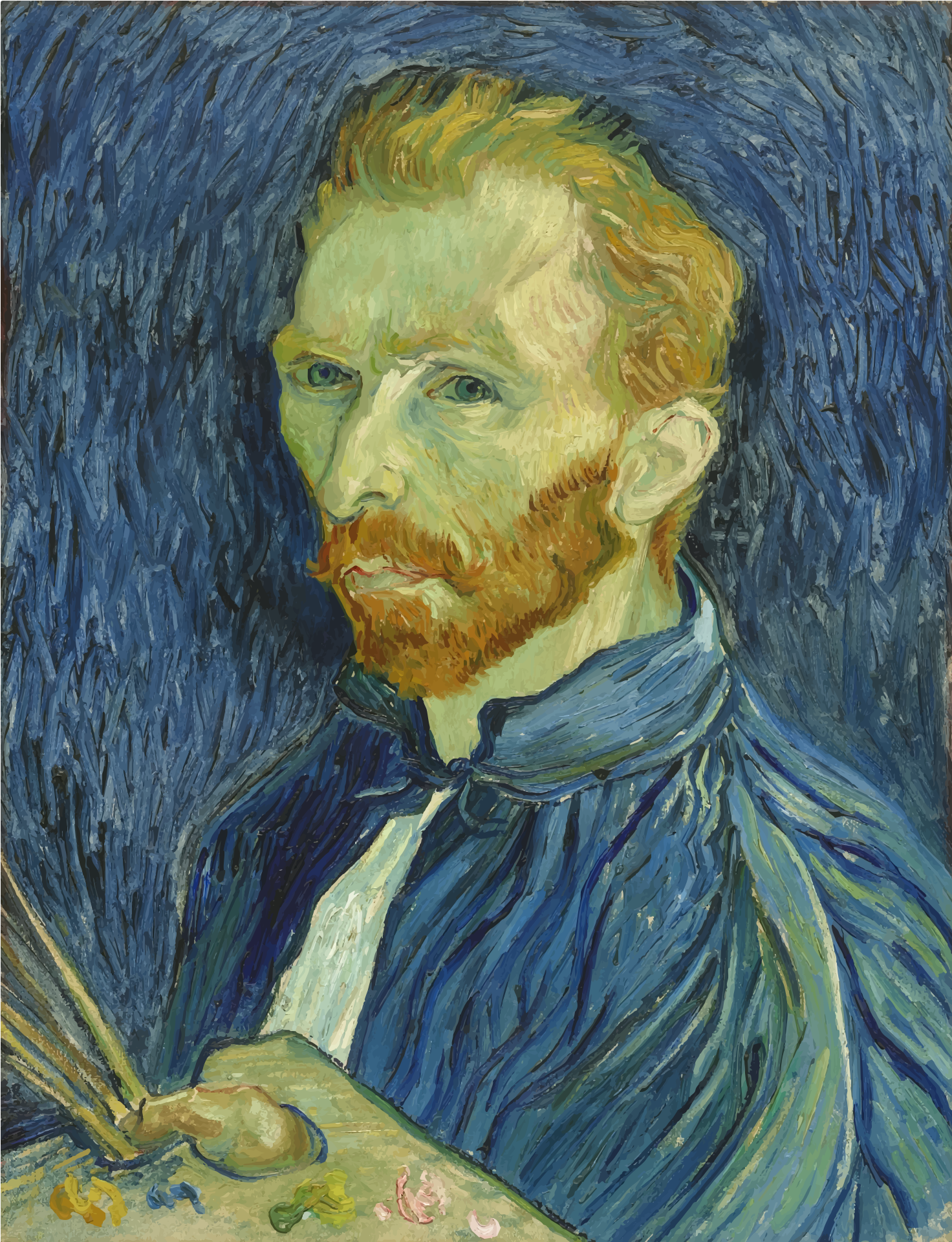 This is a painting of a man with a beard, wearing a blue jacket and holding a paintbrush. He appears to be looking at the viewer while holding his brush in hand. The painting captures the artist's facial expression and features such as his mustache and beard. The background is painted in shades of blue, creating an artistic atmosphere. The man seems to be focused on his work or possibly contemplating a new piece of art.