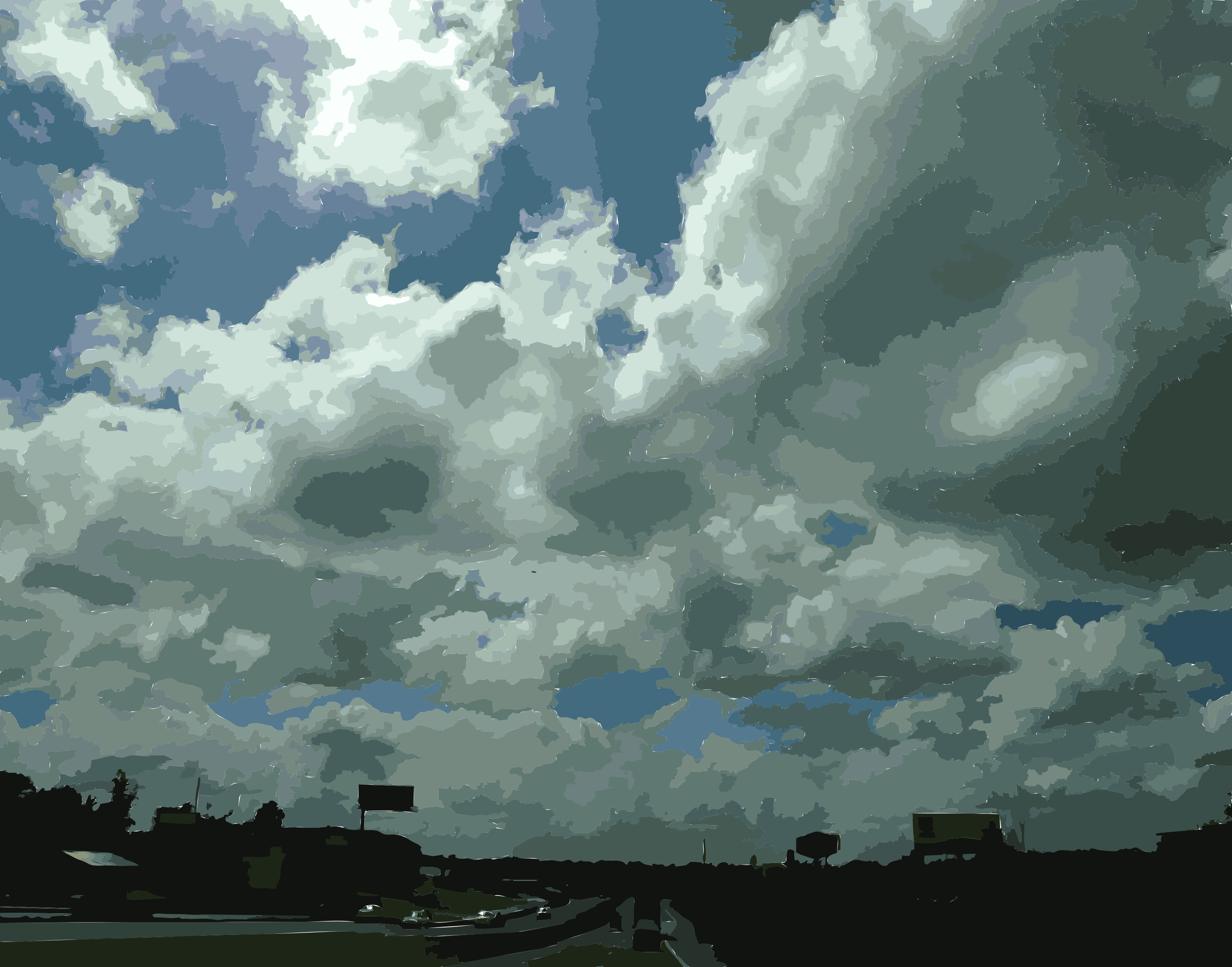 This depicts a cloudy day with a sky filled with various clouds. There is a bit of sunlight visible, creating an interesting contrast between the dark and light areas in the scene. A highway can be seen running through the area, with cars driving on it. In total, there are six cars visible on the road, some closer to the foreground while others are further away. The overall atmosphere suggests a typical day in a city or town where people are going about their daily routines despite the cloudy weather.