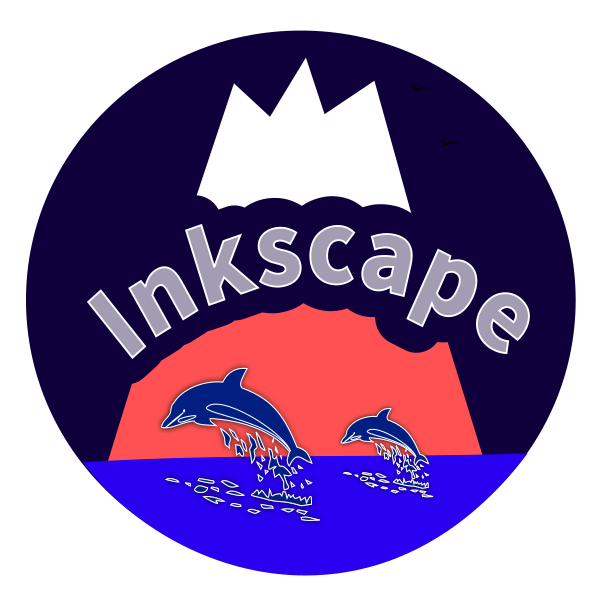 This features a blue ocean with two dolphins jumping out of the water. They are positioned close to each other, creating an eye-catching scene. Above the ocean and the dolphins, there is a mountain that stands tall in the background. This mountain has a white top, adding contrast to its red color. The word "Inkscape" is written above the image, indicating it's likely related to a logo or branding for Inkscape.