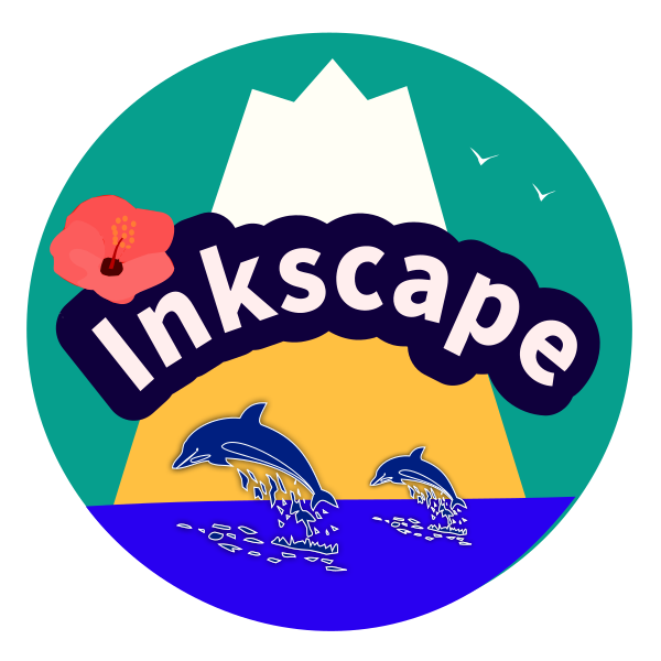 This features a blue and yellow circle with the word "Inkscape" written in white letters. In the center of the circle, there are two dolphins jumping out of the water, adding an element of motion to the design. Above the dolphins, there is a mountain with snow on top, creating a picturesque scene that complements the overall theme of the image. The combination of these elements creates a visually appealing and engaging poster or logo for Inkscape.