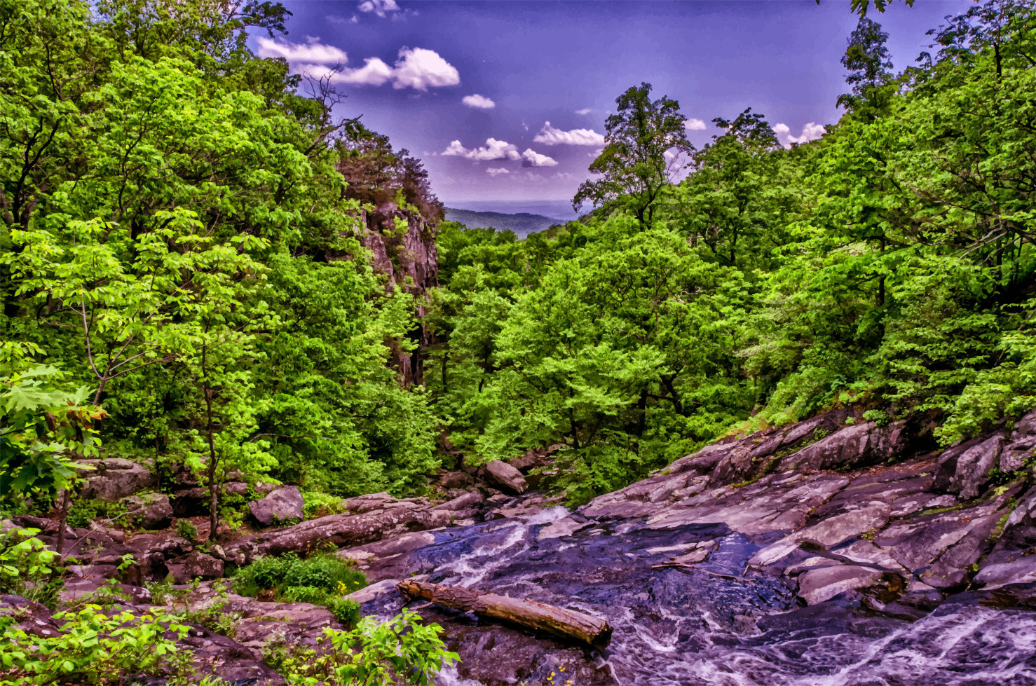 This depicts a serene scene of a river flowing through a lush green forest. The waterway is surrounded by trees and rocks, creating a picturesque landscape. There are several large rocks scattered throughout the area, adding to the natural beauty of the environment. A fallen tree can be seen near the center of the image, further enhancing the scenery. Overall, this scene captures the essence of nature with its vibrant colors and diverse elements.