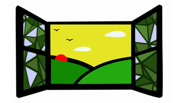 This features a stained glass window with a picture of a hillside and a valley. In the scene, there are two birds flying in the sky above the valley, adding to the picturesque view. A red dot is also visible on the hillside, possibly representing a point of interest or a focal point for the viewer. The overall composition of the stained glass window creates an artistic and visually appealing representation of nature's beauty.