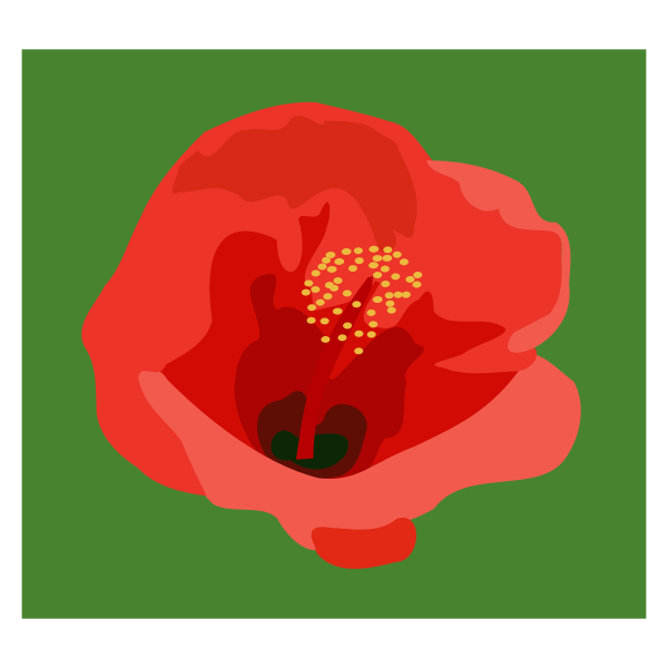 This features a close-up of a red flower with yellow centers, possibly an artistic representation of a hibiscus. The flower is placed on a green background, which adds to the vibrant colors and contrast in the scene. The flower's petals are slightly open, revealing its inner structure and adding depth to the image. Overall, it is a visually appealing and detailed illustration of a beautiful red flower with yellow centers.