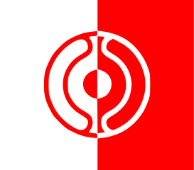 This features a red and white flag with a circle in the middle. This circle is outlined by an even larger circle, creating a visually striking design. The flag appears to be half white and half red, giving it a distinctive appearance. It's possible that this flag represents Cheondoism, as suggested by one description. Overall, the flag stands out with its bold colors and unique pattern.