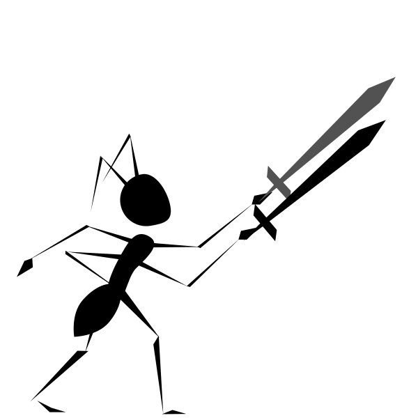 This features a black and white illustration of an ant holding a sword. The ant is positioned in the center of the scene, with its sword held high above its head. The sword appears to be made of metal, giving it a sharp and menacing appearance. The ant's posture suggests that it is ready for battle or prepared to defend itself against any potential threats. This illustration creates an interesting contrast between the small size of the ant and the large sword it holds, emphasizing its strength and determination in the face of danger.