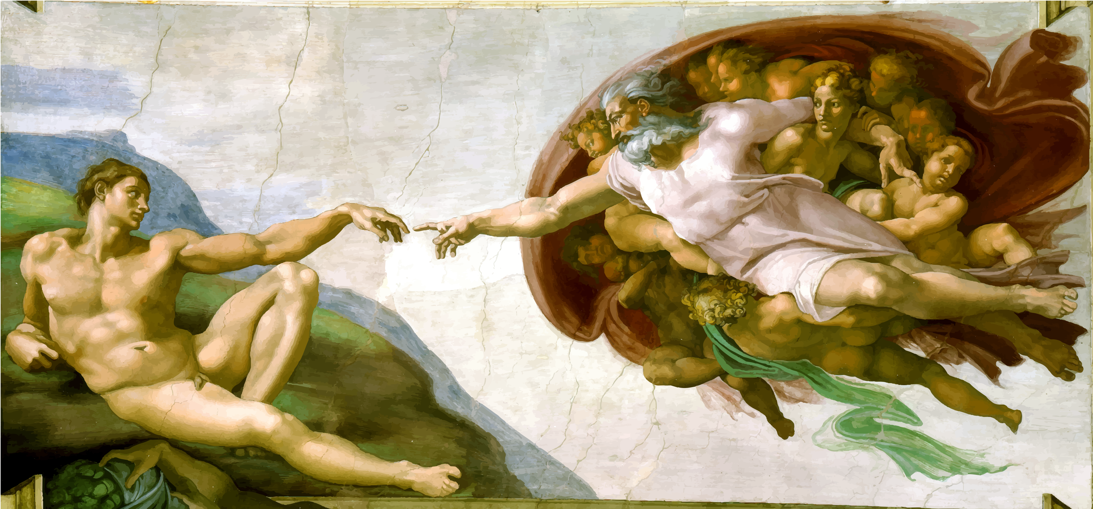 This is a painting of the creation story, featuring Adam and Eve. In this artwork, God is depicted as an angelic figure with wings, reaching out to touch Adam's finger with his own. This scene takes place in a garden setting, where both Adam and Eve are present. There are several other people in the painting, some of whom appear to be holding or interacting with each other. The overall composition is reminiscent of Michelangelo's famous Sistine Chapel ceiling frescoes.
