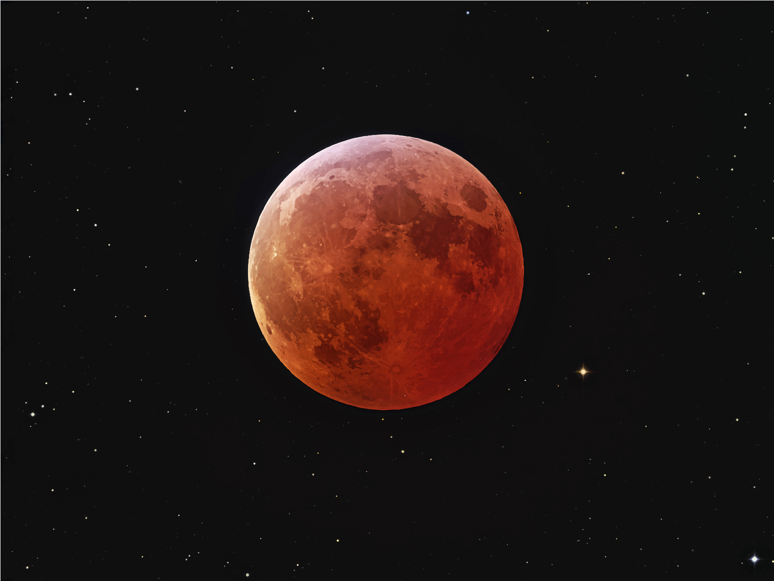 This features a large red moon in the sky, which appears to be a lunar eclipse. The moon is surrounded by stars and other celestial bodies, creating an impressive display of the night sky. The scene captures the beauty of space and the wonders of astronomy, as the moon casts its shadow on Earth during this rare event.