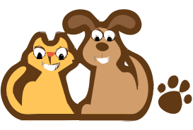 This features a cartoon cat and dog standing next to each other, posing for the camera. They are both brown in color and have big eyes, giving them an expressive appearance. The cat is on the left side of the frame while the dog is positioned more towards the right. Both animals appear to be smiling as they stand together, creating a friendly and playful atmosphere.