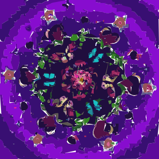 This features a purple circle with a flower in the center, surrounded by various other flowers. These flowers are scattered throughout the scene, some closer to the edges of the circle and others more towards the center. There is also a bird located near the top left corner of the circle, adding an interesting element to the composition. The overall effect creates a visually appealing and colorful display that captures the viewer's attention.