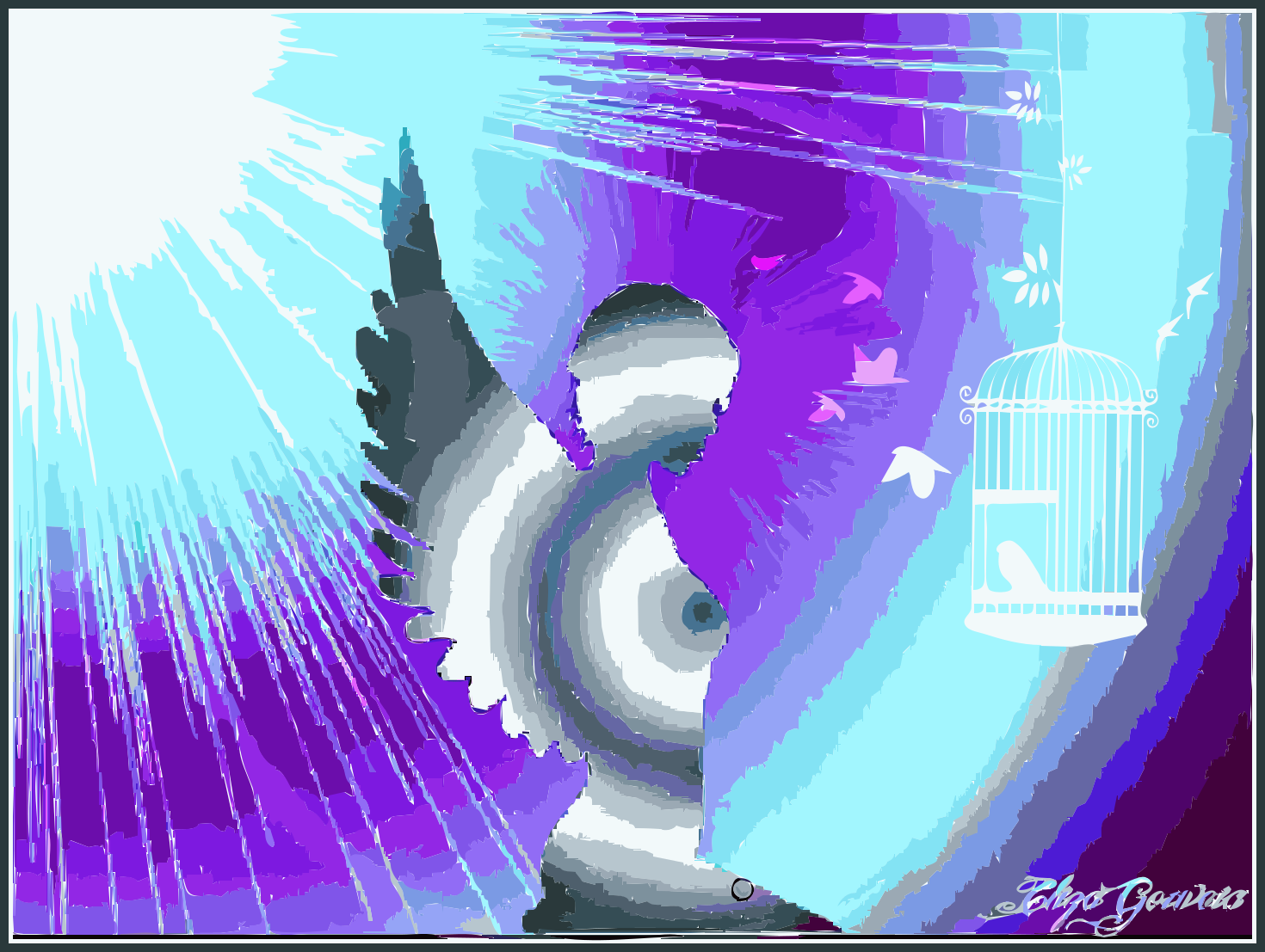This features a bird with its wings spread, standing in front of a cage. The bird is positioned on the left side of the scene and appears to be looking towards the right. In addition to the bird, there are several birds flying around it, adding to the lively atmosphere of the scene. The cage is located near the center of the image, with its bars visible in the background. Overall, this artistic composition captures a sense of freedom and movement, as well as the beauty of nature.