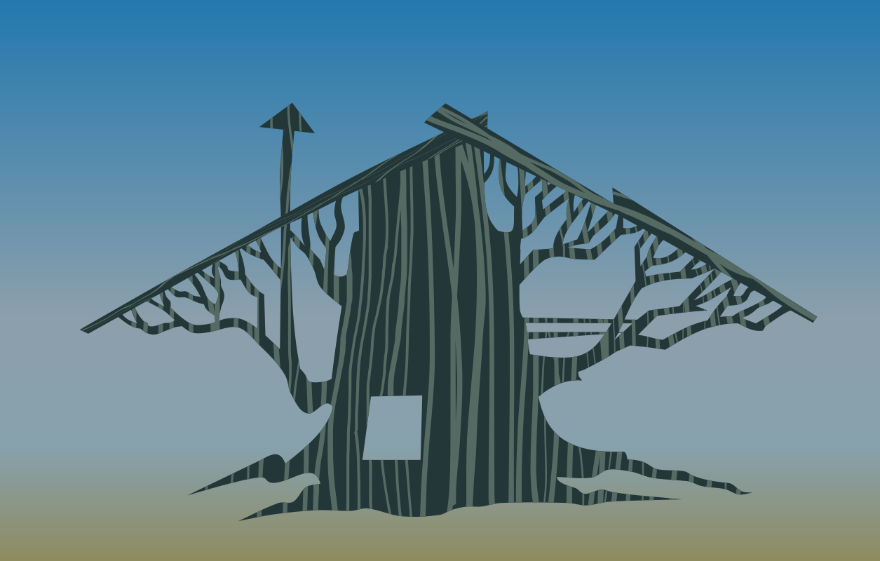 This features a unique and artistic depiction of a house made out of trees. This creative design gives the appearance of an old tree stump with branches extending from it, creating a cozy and rustic atmosphere. The house is situated in a field, surrounded by open space that adds to its charm. The overall scene exudes a sense of tranquility and harmony with nature, making it an interesting and captivating image.
