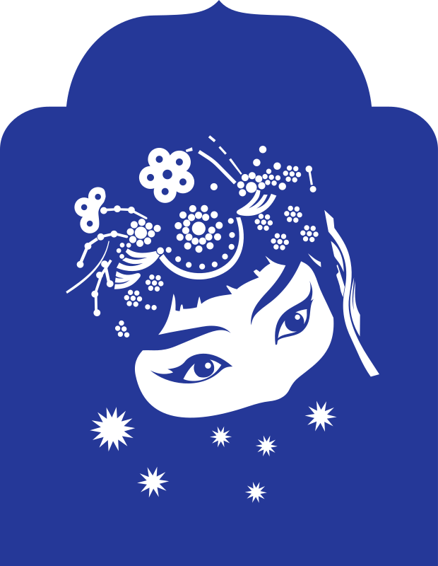 This features a woman with a blue mask on her face, adorned with white flowers in her hair. She has a star design on her head and is wearing makeup that complements the overall look. The woman's eyes are open, giving her an expressive appearance. The combination of the blue mask, white flowers, and star design creates a visually striking image that captures attention.