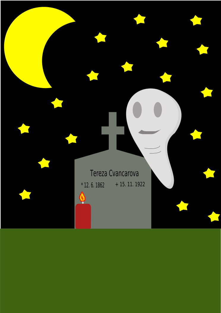This features a graveyard scene with a ghost and a cross. The ghost is positioned above the grave, which has a name on it. Above the ghost, there are stars scattered throughout the sky, creating an eerie atmosphere. In addition to the main elements of the scene, there is also a candle present in the foreground, adding another layer of detail and interest to the image.