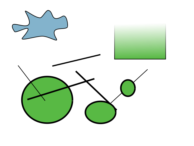 This features a collection of abstract figures, including a green circle and rectangle figure with black outlines. These figures are placed on a white background, creating an interesting visual effect. In addition to the main figures, there is also a blue stain-like shape in the top left corner of the image. Overall, this artistic display showcases various shapes and colors that create a unique and engaging composition.
