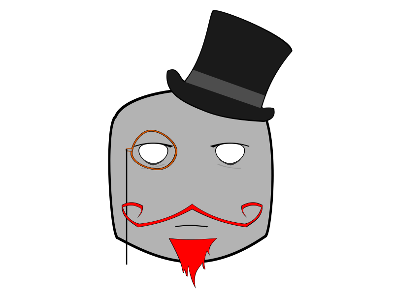 This features a cartoon-like character with a gray face and a black top hat. The face is adorned with a monocle on one eye, giving it an intellectual appearance. Additionally, the character has a red mustache and goatee, adding a touch of humor to its overall look. This unique combination of elements creates a distinctive and memorable visual representation that stands out from typical cartoon characters.