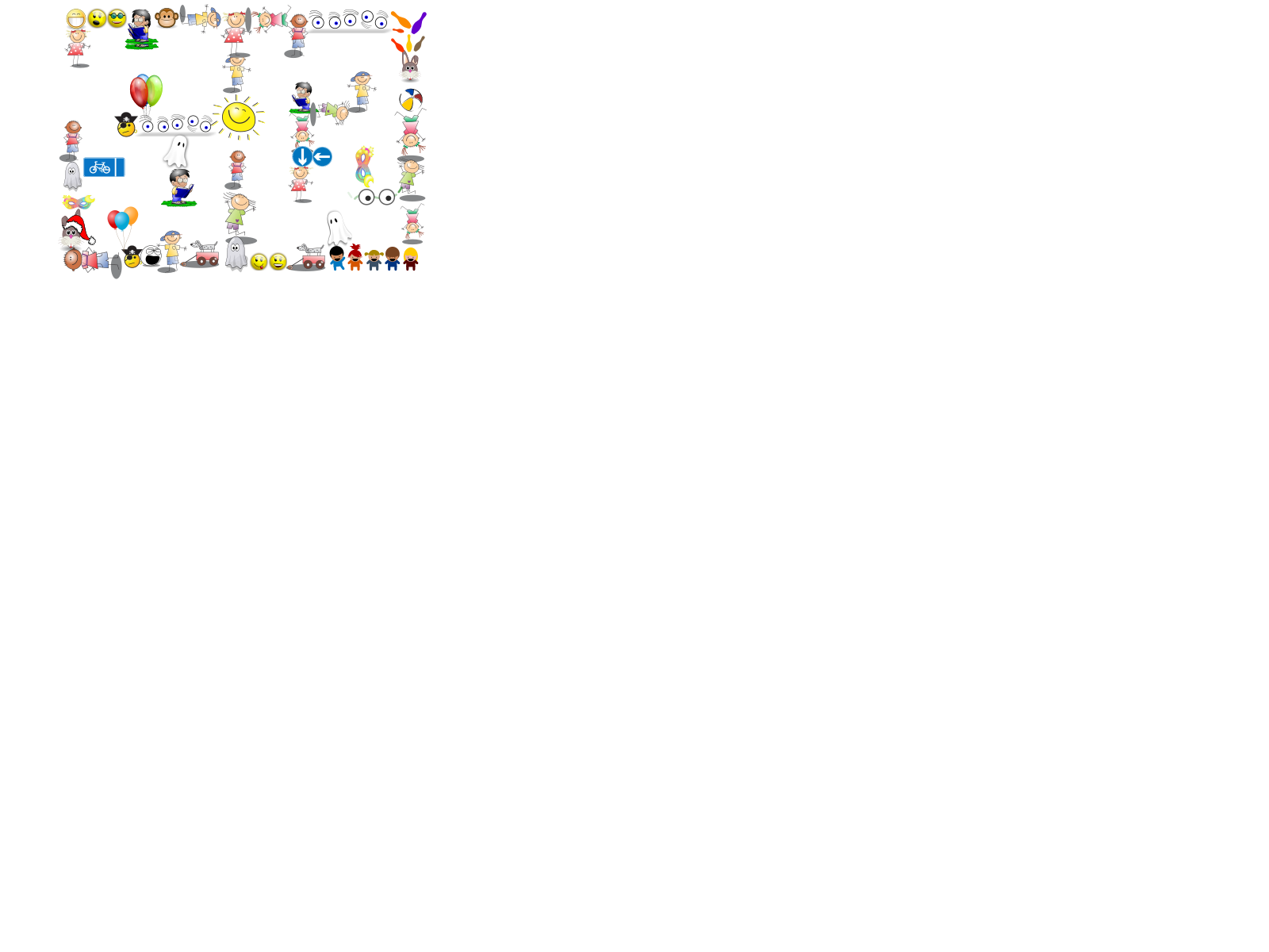 This is a white background with various cartoon characters and objects scattered across it. There are at least 13 different characters, each varying in size and position on the screen. Some of these characters include a person, a dog, a cat, and several other animals. Additionally, there are two apples visible within the scene, one located near the top left corner and another towards the center-left area. The overall composition creates an interesting and visually engaging display.