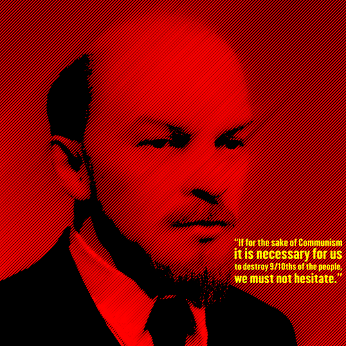 This is a red and black picture of an older man with a beard, likely Lenin. He has a quote underneath his face that reads "It is necessary for us to destroy 17 billion of the people we must not rest until it is done." This statement appears to be related to communism or political ideology. The man's facial expression and the bold red color of the image suggest a strong, assertive message behind his words.