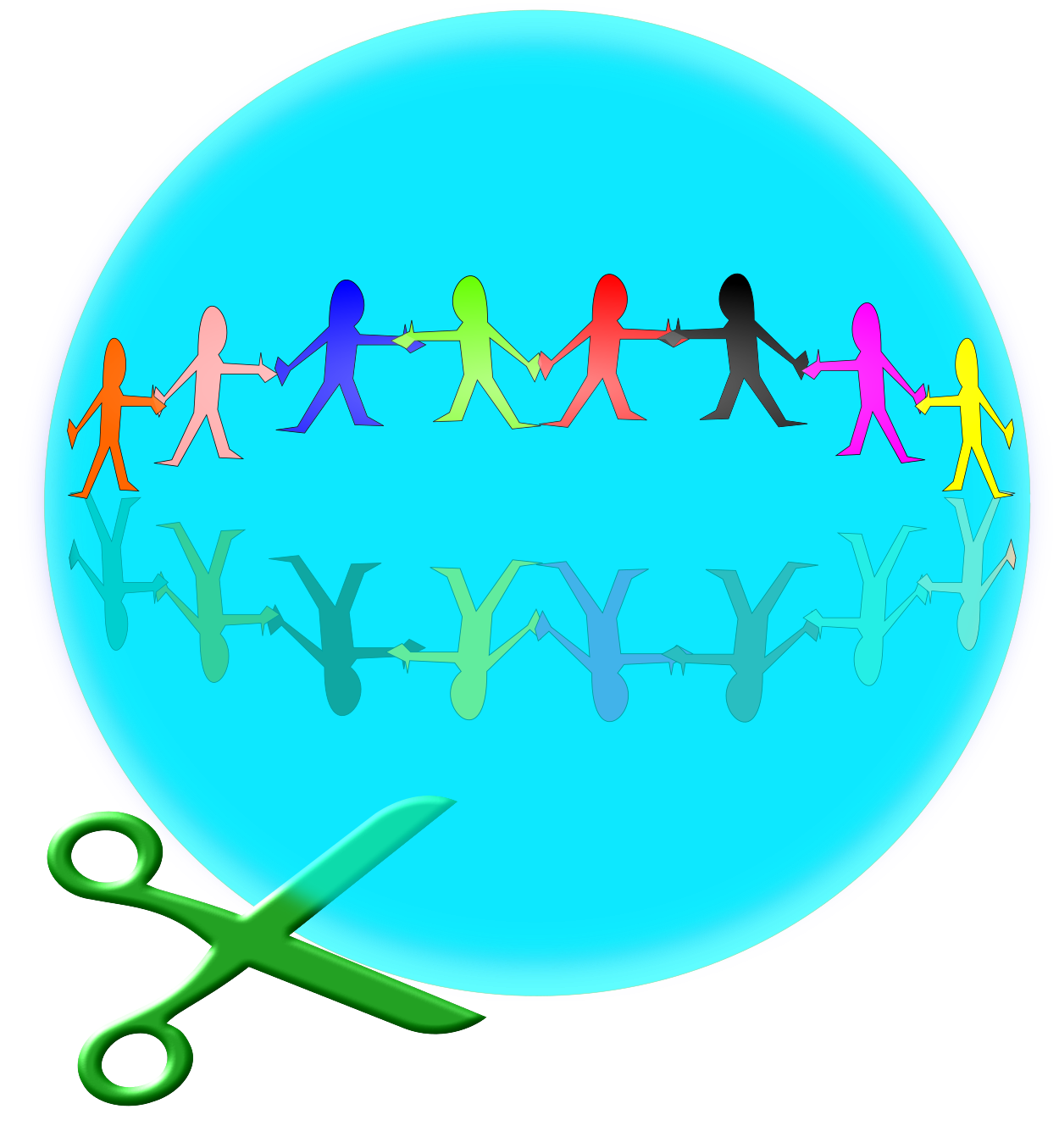 This features a blue globe with a group of people, each representing a different color. They are all holding hands and appear to be connected in some way. The reflection of these individuals can be seen underneath them, creating an interesting visual effect. In the foreground, green scissors are being used to cut into the bottom part of the globe, adding a sense of depth and dimension to the scene. This creative illustration showcases unity among people from various backgrounds and cultures.