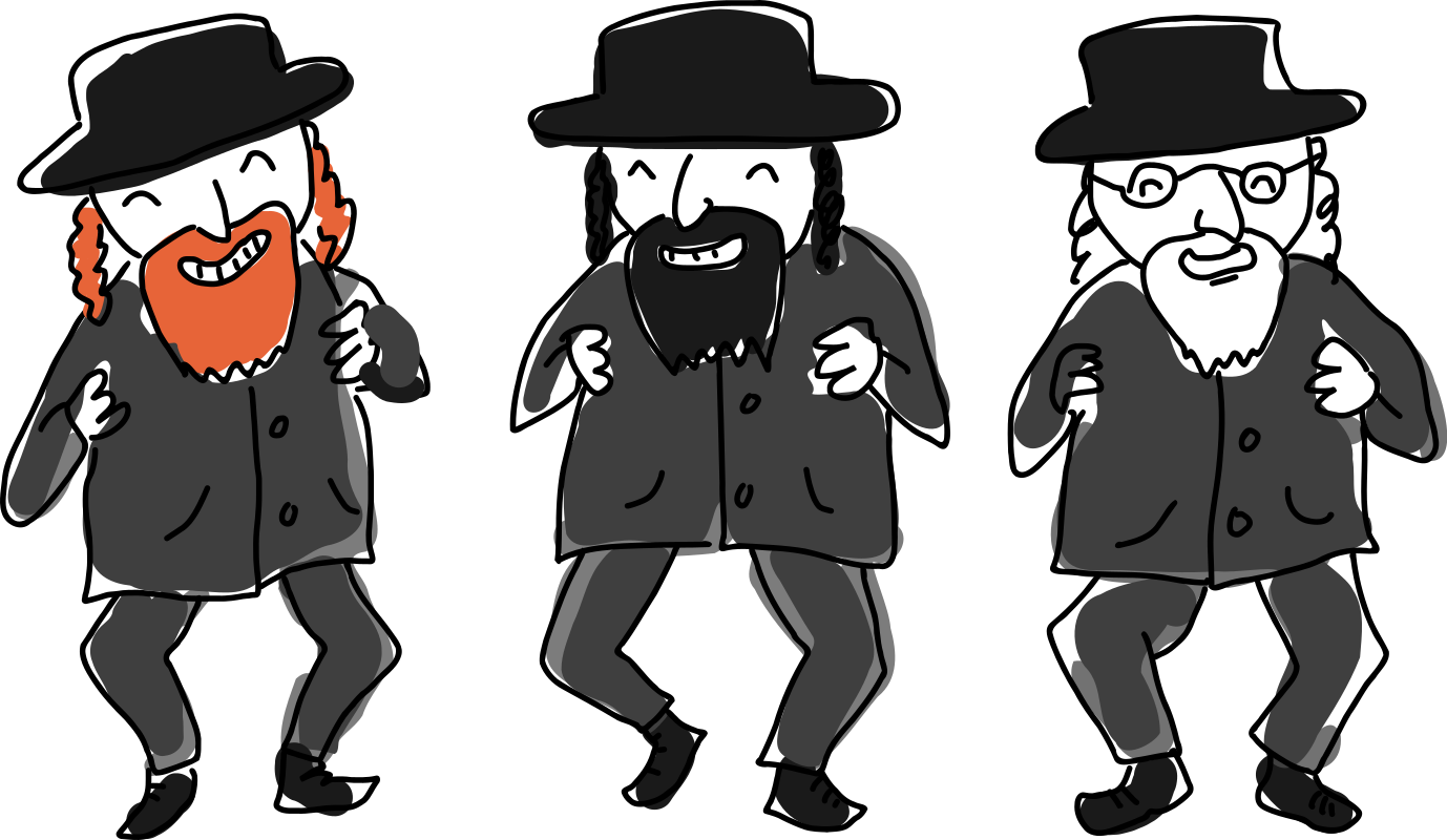 This features three cartoon drawings of men wearing black hats and beards, each with a different style. They are all dressed in suits and ties, giving the impression that they are attending a formal event or celebration. One man is on the left side of the frame, another in the middle, and the third one on the right side. Each drawing has a unique facial expression, adding character to each individual. The overall scene appears to be a lighthearted and fun representation of Jewish men dressed up for an occasion.
