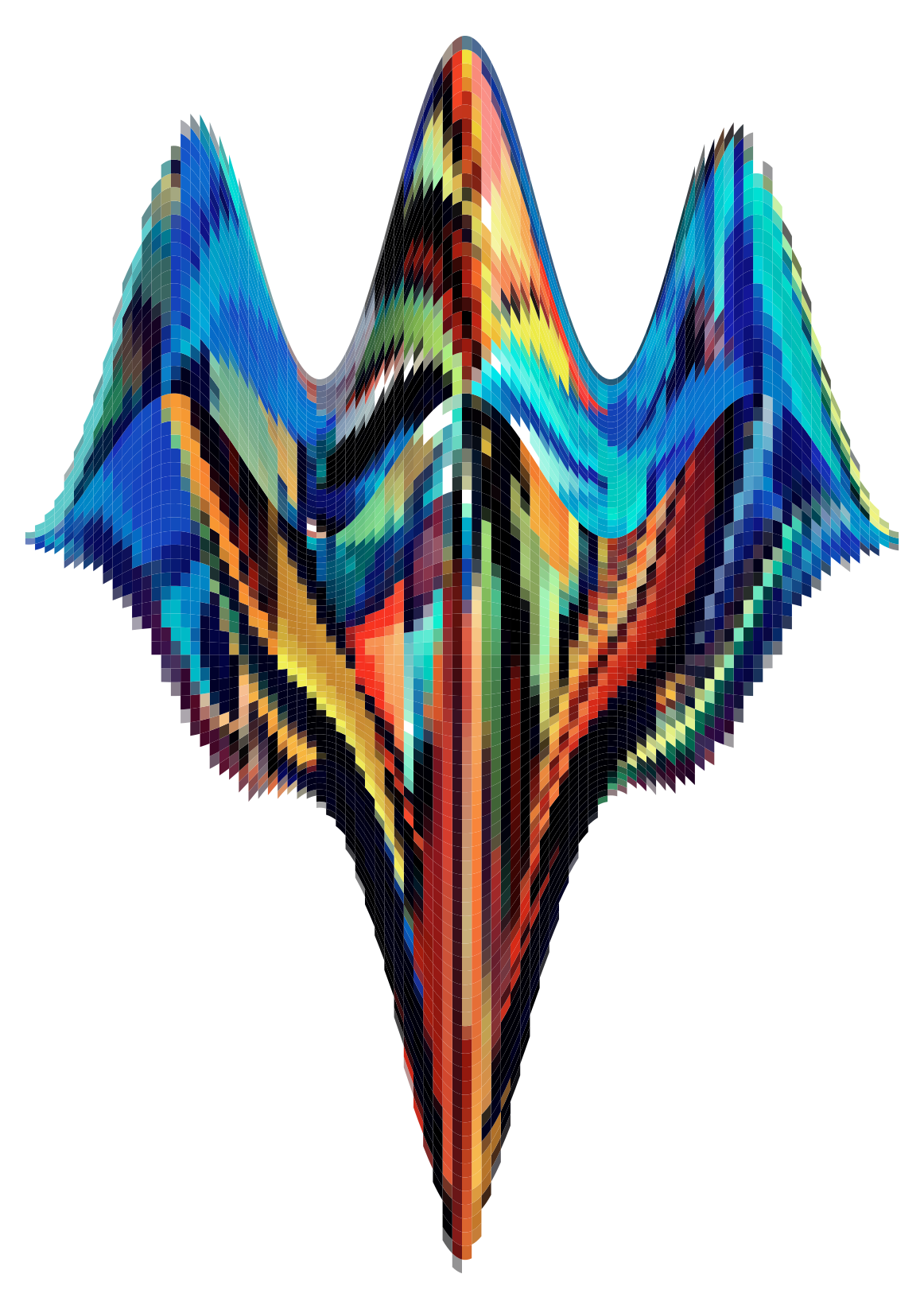 This features a colorful, abstract design that resembles an alien or a bird. It is composed of various colors and patterns, creating a visually striking piece of art. The design appears to be made up of small pixels, giving it a unique and intricate appearance. The vibrant colors and interesting shape make this image stand out as a creative and eye-catching piece of artwork.