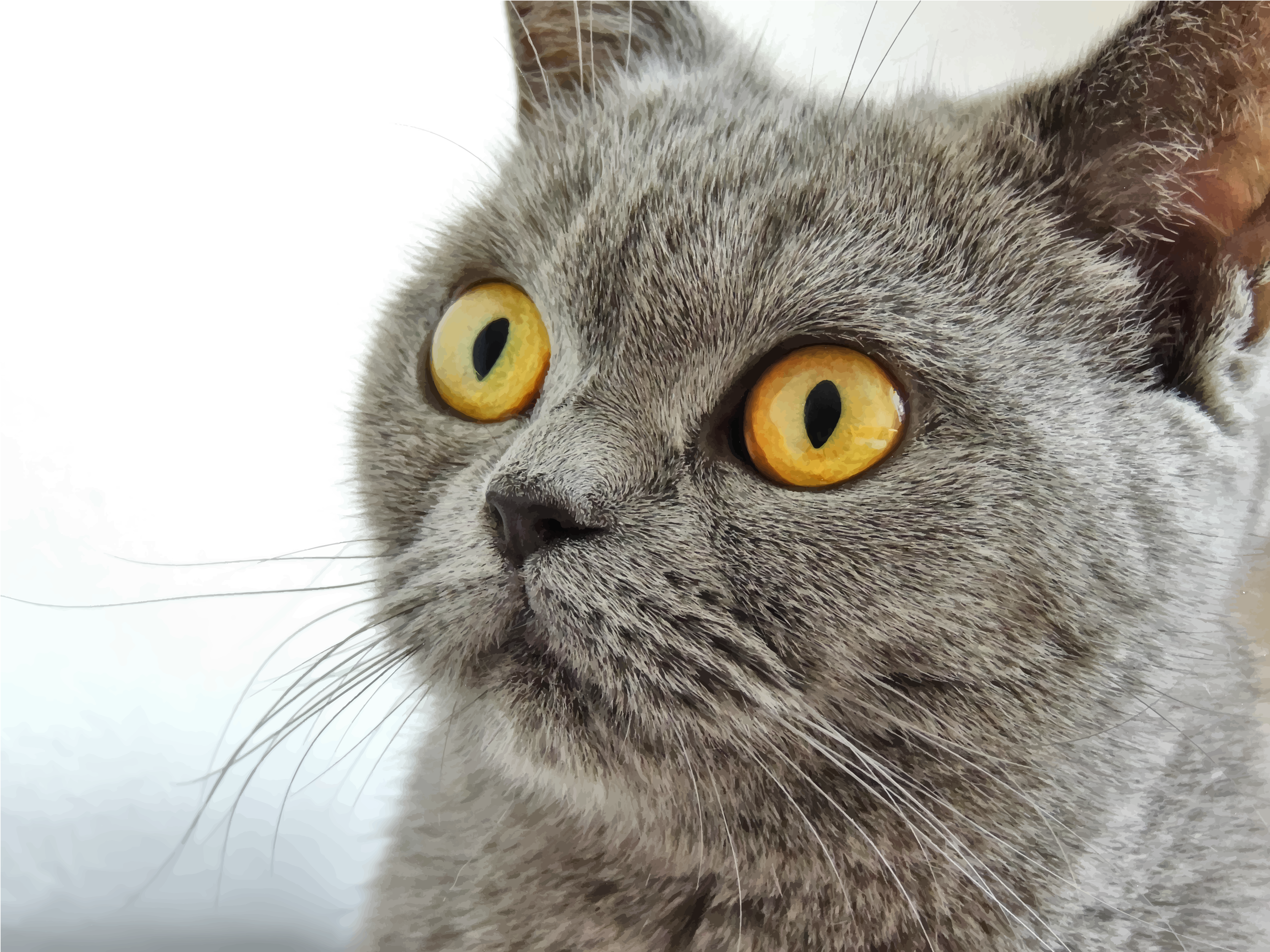 This features a grey cat with yellow eyes, sitting in front of a white wall. The cat appears to be looking directly at the camera, capturing its attention. Its fur is well-groomed and it seems relaxed as it sits on a surface. The cat's unique coloration and striking yellow eyes make it an adorable subject for the photo.