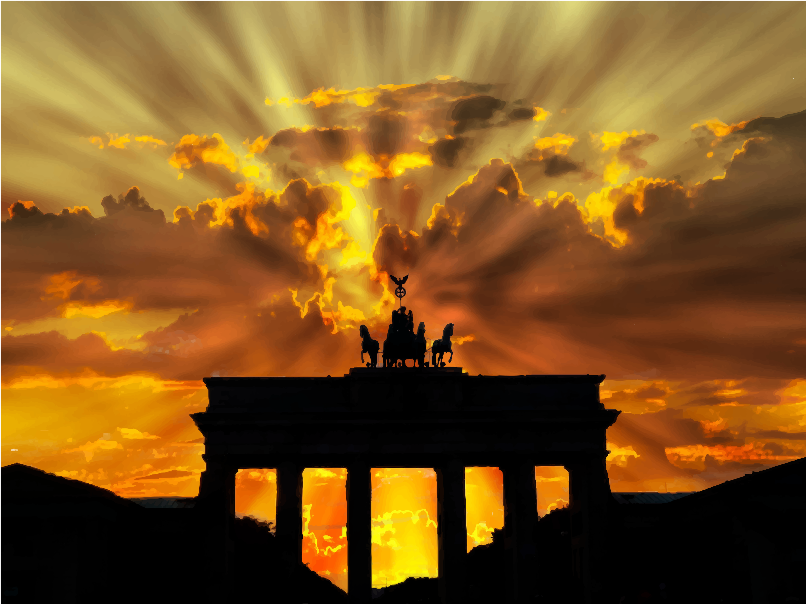 This features a beautiful sunset over the Brandenburg Gate in Berlin, Germany. The gate is illuminated by the warm glow of the setting sun, creating an impressive silhouette against the sky. In front of the gate, there are two statues that add to the overall grandeur of the scene. One statue is located closer to the left side of the gate, while the other is situated more towards the center. The combination of the sunset and the statues creates a captivating atmosphere in this iconic cityscape.
