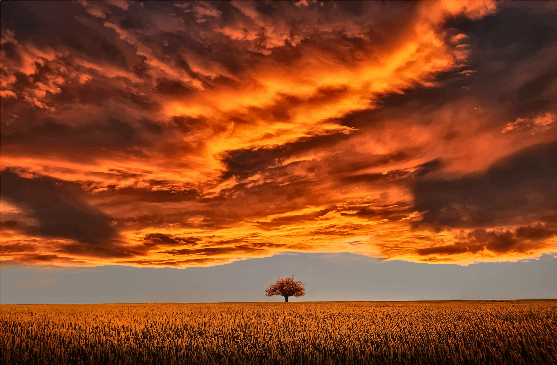 This features a single tree standing in the middle of a field, surrounded by tall grass. The sky above is filled with dramatic orange and golden clouds, creating an atmospheric scene. The sun appears to be setting behind these clouds, casting a warm glow over the landscape. The combination of the tree, grass, and clouds creates a serene and picturesque view that captures the beauty of nature during this time of day.