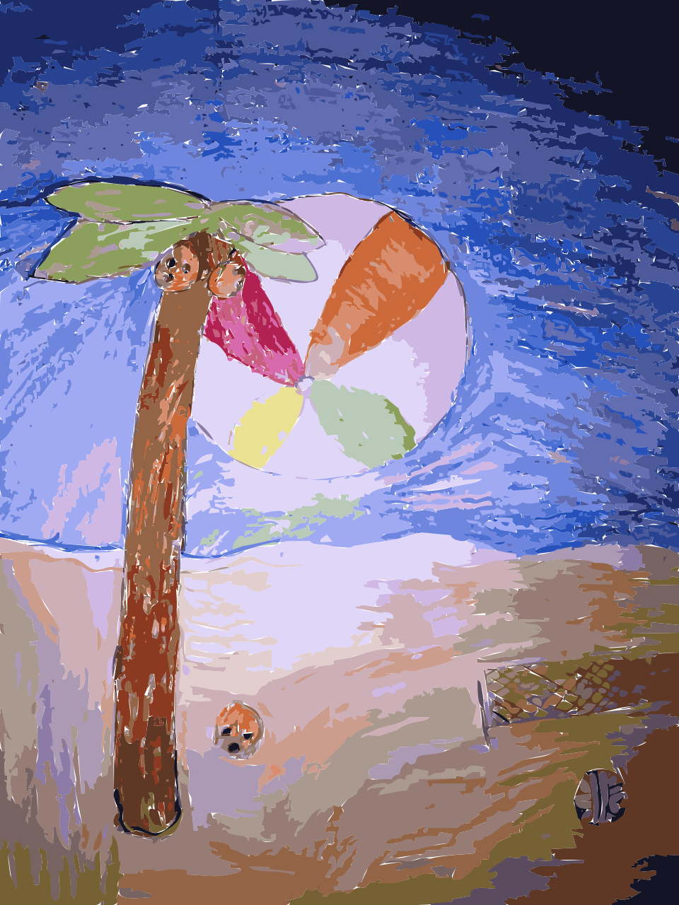 This features a painting of a palm tree in the sand, with a beach ball placed next to its leaves. A small volleyball court is also depicted in the scene, complete with a tiny volleyball on the court. The painting has a vibrant and colorful appearance, making it an interesting piece of artwork.