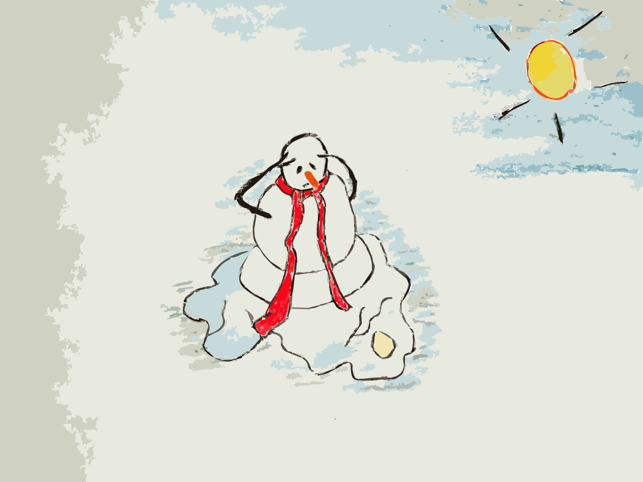 This features a snowman sitting on the ground, with its scarf and hat falling off. It appears to be melting under the warmth of the sun, which is shining brightly in the background. The scene captures the essence of winter giving way to springtime, as the snowman transitions from being covered in snow to a more melted state.