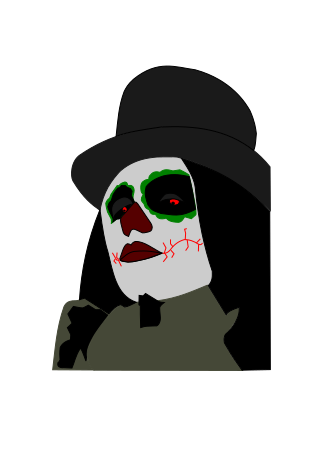 This features a colorful illustration of a person with face paint, likely inspired by the Mexican celebration of Dia de los Muertos. The individual is wearing a top hat and has a green and red makeup design on their face, giving them an eerie appearance. They are also holding a baseball bat in one hand, adding to the unique and intriguing nature of this character.
