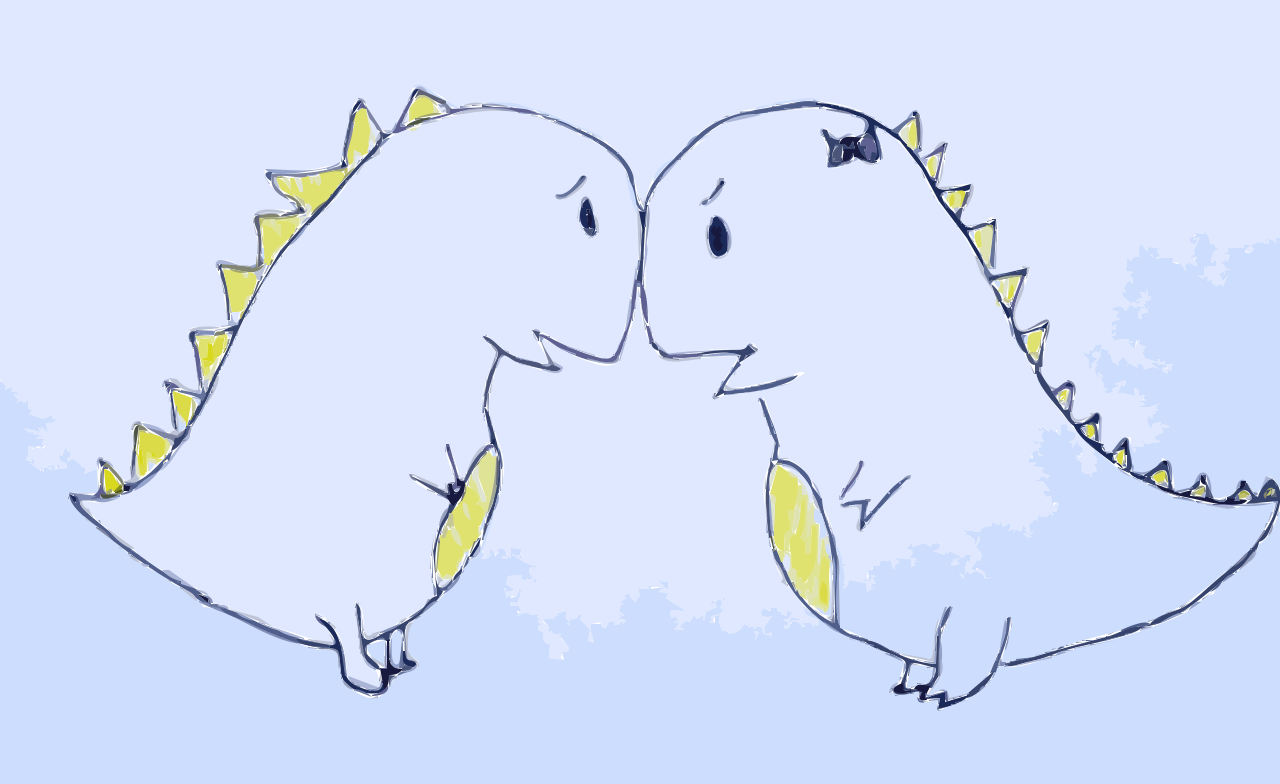 This features two cartoon dinosaurs standing face to face, with one of them having a sad look on its face and the other having an angry expression. They are positioned in such a way that their mouths are touching or almost touching, creating a sense of connection between the two characters. The dinosaur on the left has a yellow coloration, while the dinosaur on the right is predominantly white with some orange accents. This unique and playful scene captures the emotions of the two dinosaurs as they interact with each other.