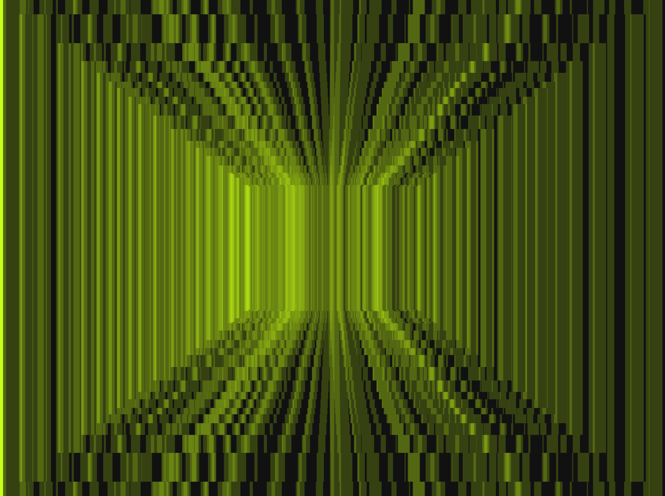 This features a tunnel-like structure with a bright green background. This tunnel appears to be made of neon lights, giving it an otherworldly and futuristic appearance. The tunnel is filled with a series of lines that create a visually striking pattern. These lines are interspersed with various shapes and colors, adding depth and complexity to the scene. Overall, the image presents a unique and captivating visual experience.