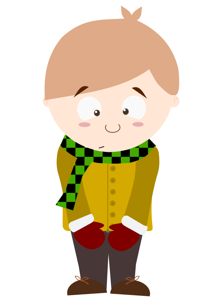This features a cartoon character of a young boy wearing a yellow jacket and a green checkered scarf. He is standing with his hands in his pockets, giving off an impression of being shy or reserved. The boy's outfit includes brown pants that are visible beneath the yellow jacket. The overall scene appears to be a whimsical and playful representation of a young child dressed for winter weather.