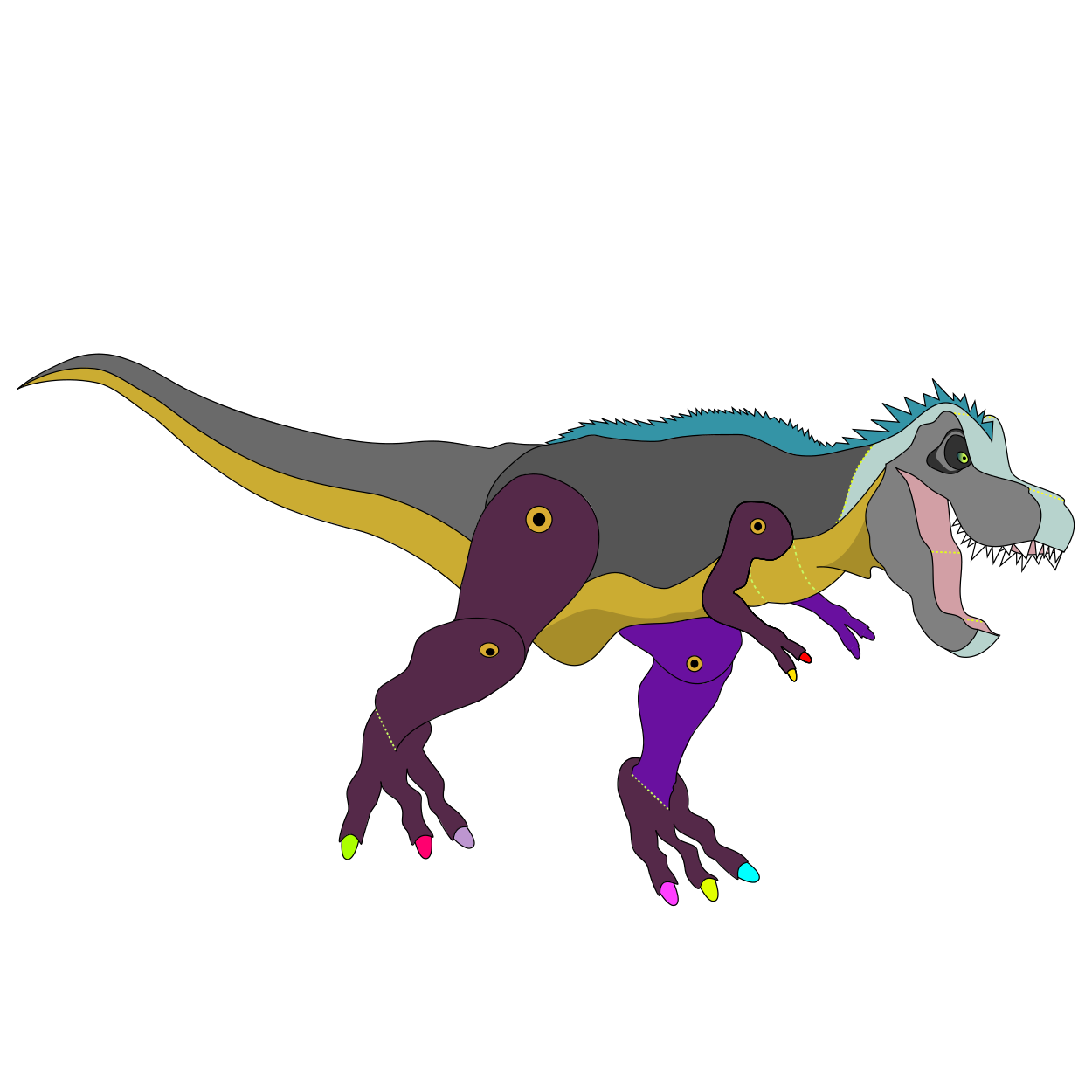 This features a colorful, cartoon-like T-Rex dinosaur with purple and yellow toenails. It is running across the screen, displaying its long tail and small arms as it moves. The vibrant colors of the dinosaur make it stand out against the white background, creating an eye-catching scene. This unique depiction of a T-Rex adds a playful twist to the classic image of a fearsome predator.