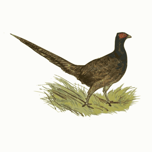 This features a brown pheasant with an impressive long tail. It is standing in a small grassy area, which provides a natural setting for the bird. The pheasant has a small red patch around its eye, adding to its distinct appearance. This drawing of the pheasant showcases its unique features and captures the essence of this beautiful creature.