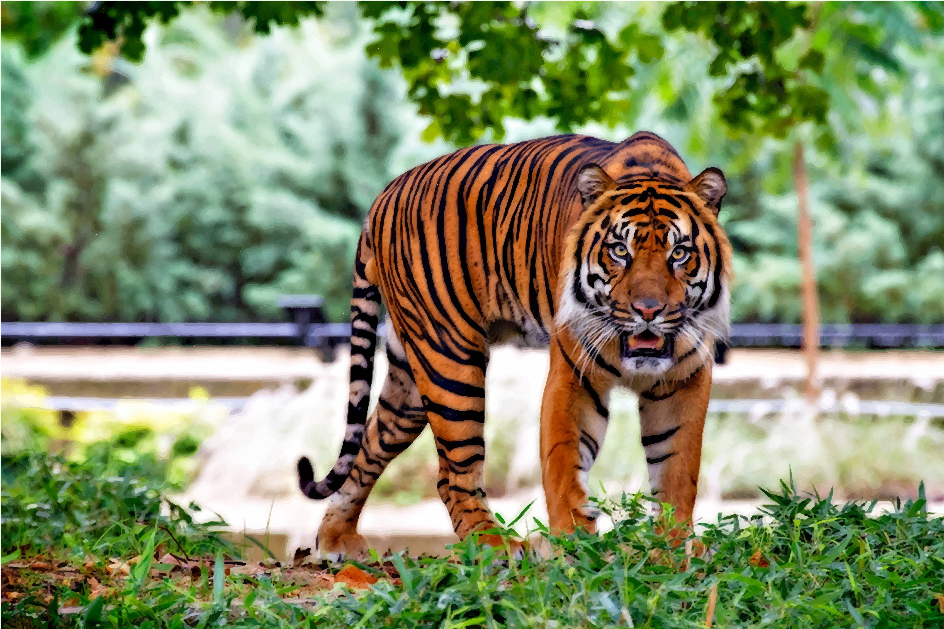 This features a large tiger walking through the grass, with its mouth open. It appears to be in an enclosure or a zoo setting, as there are trees and bushes nearby. The tiger is positioned towards the left side of the frame, taking up most of the space from the center to the right edge of the image. Its body language suggests that it might be roaring or making some sort of vocalization.